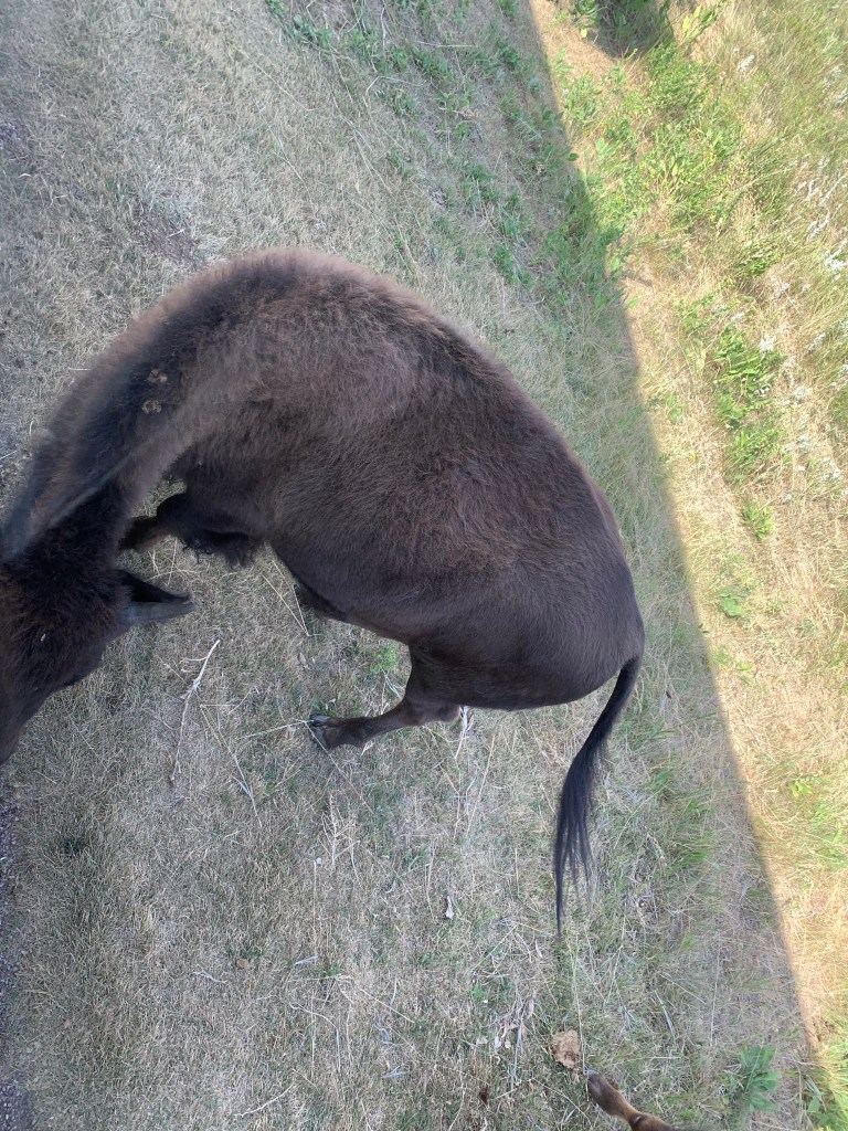One of the bison made the back of the RV his personal scratching post! The RV was moving thanks to the force he was using. Though, he left us a little souvenir of hair that we now have in a plastic bag!